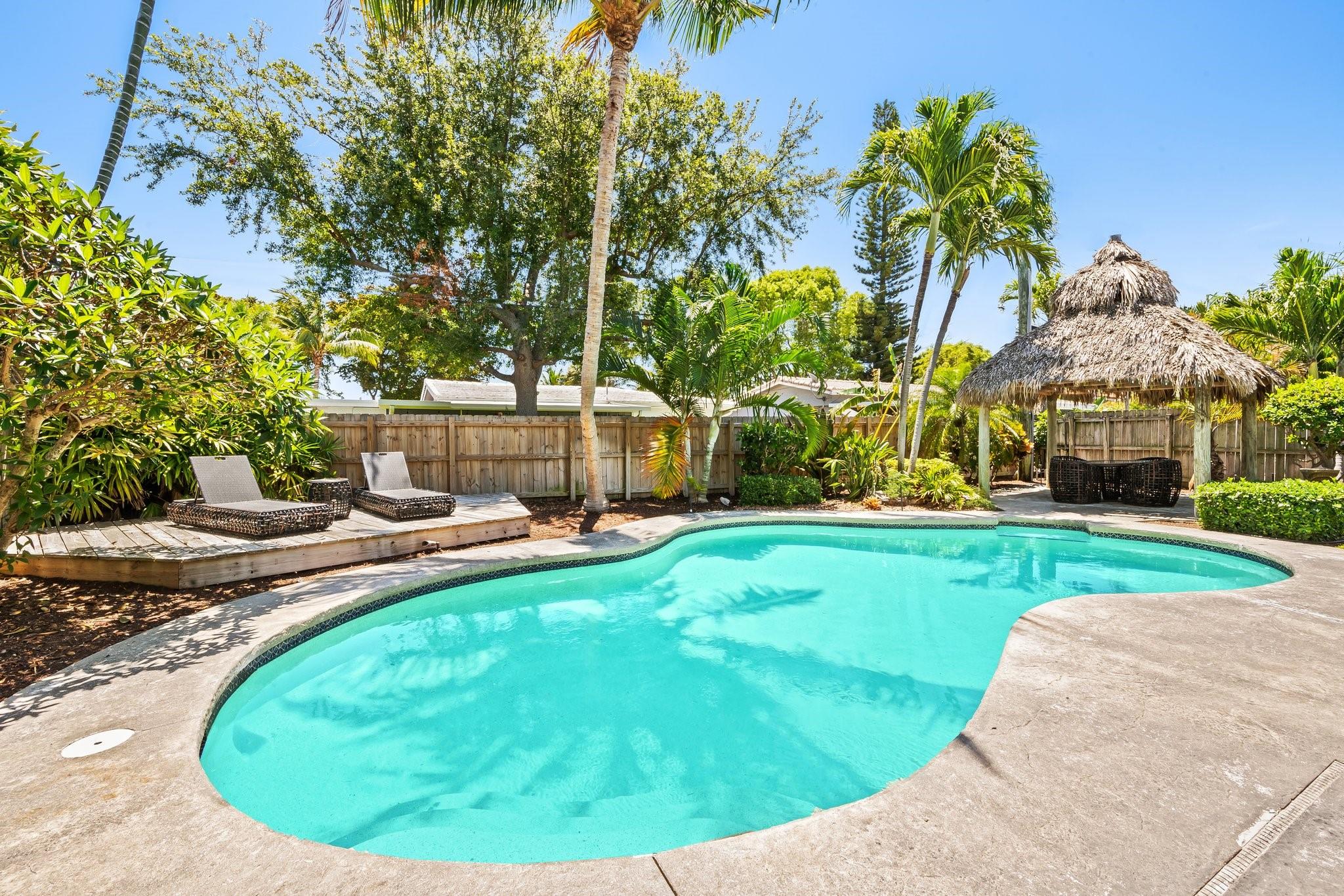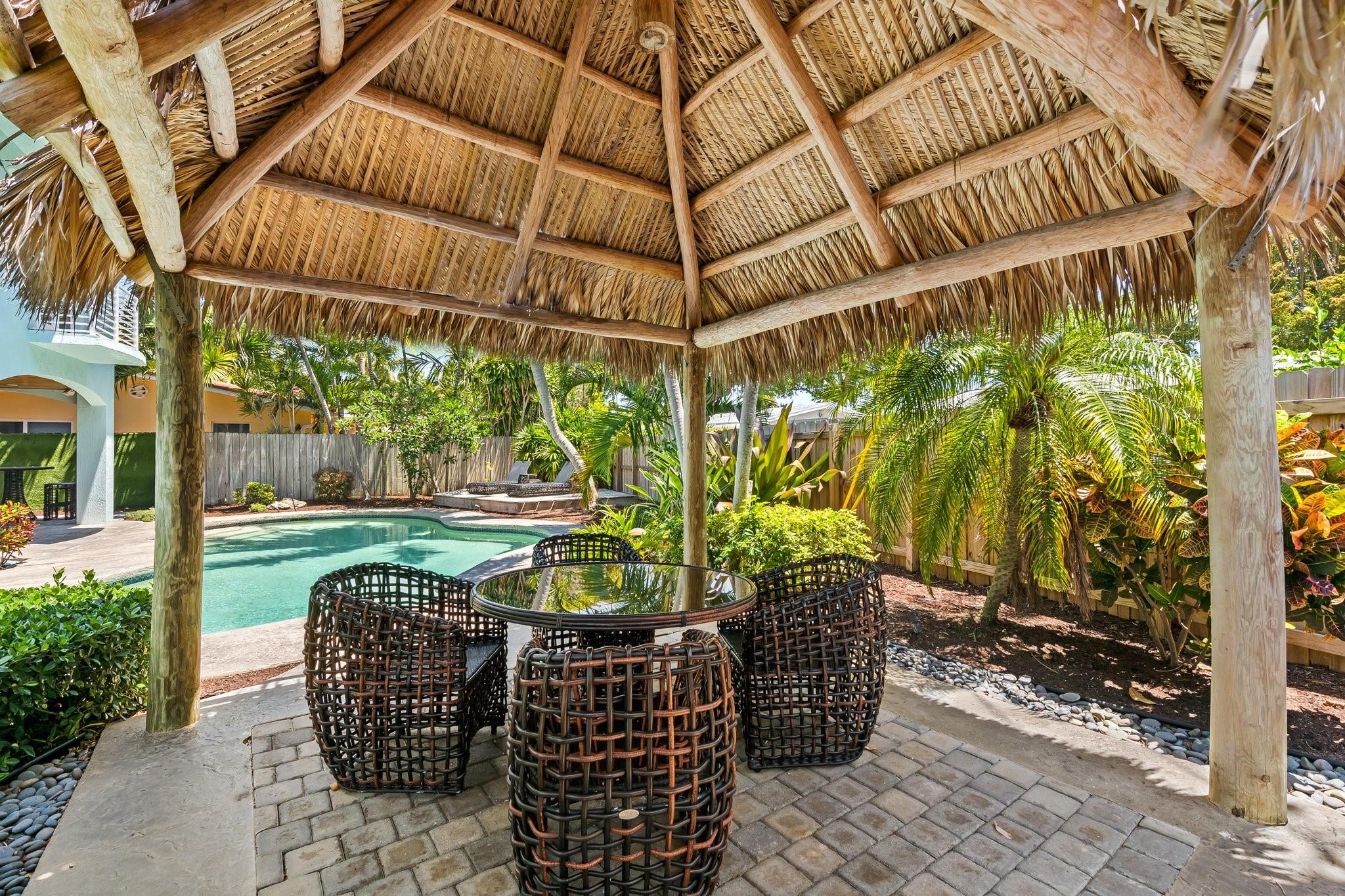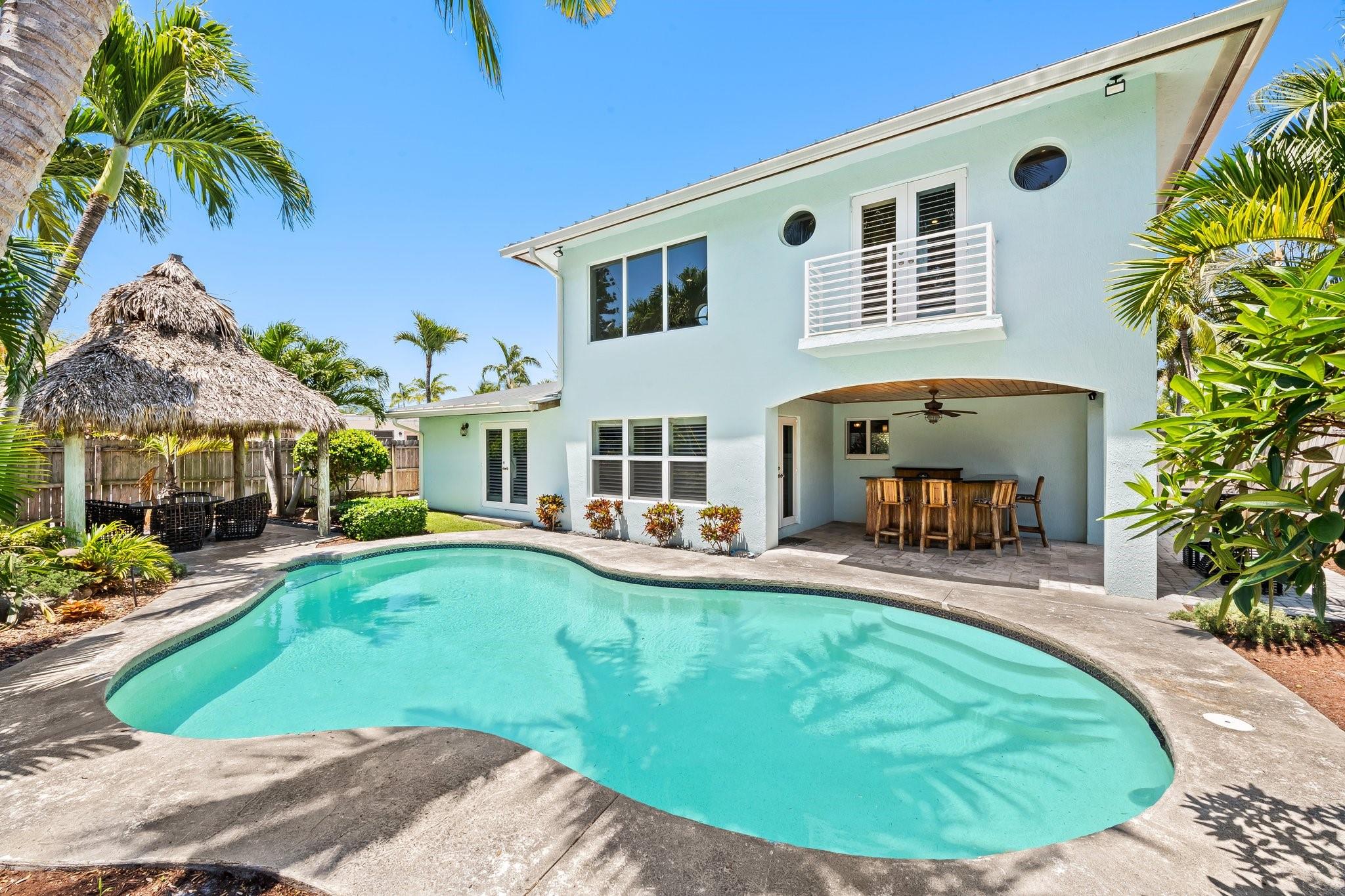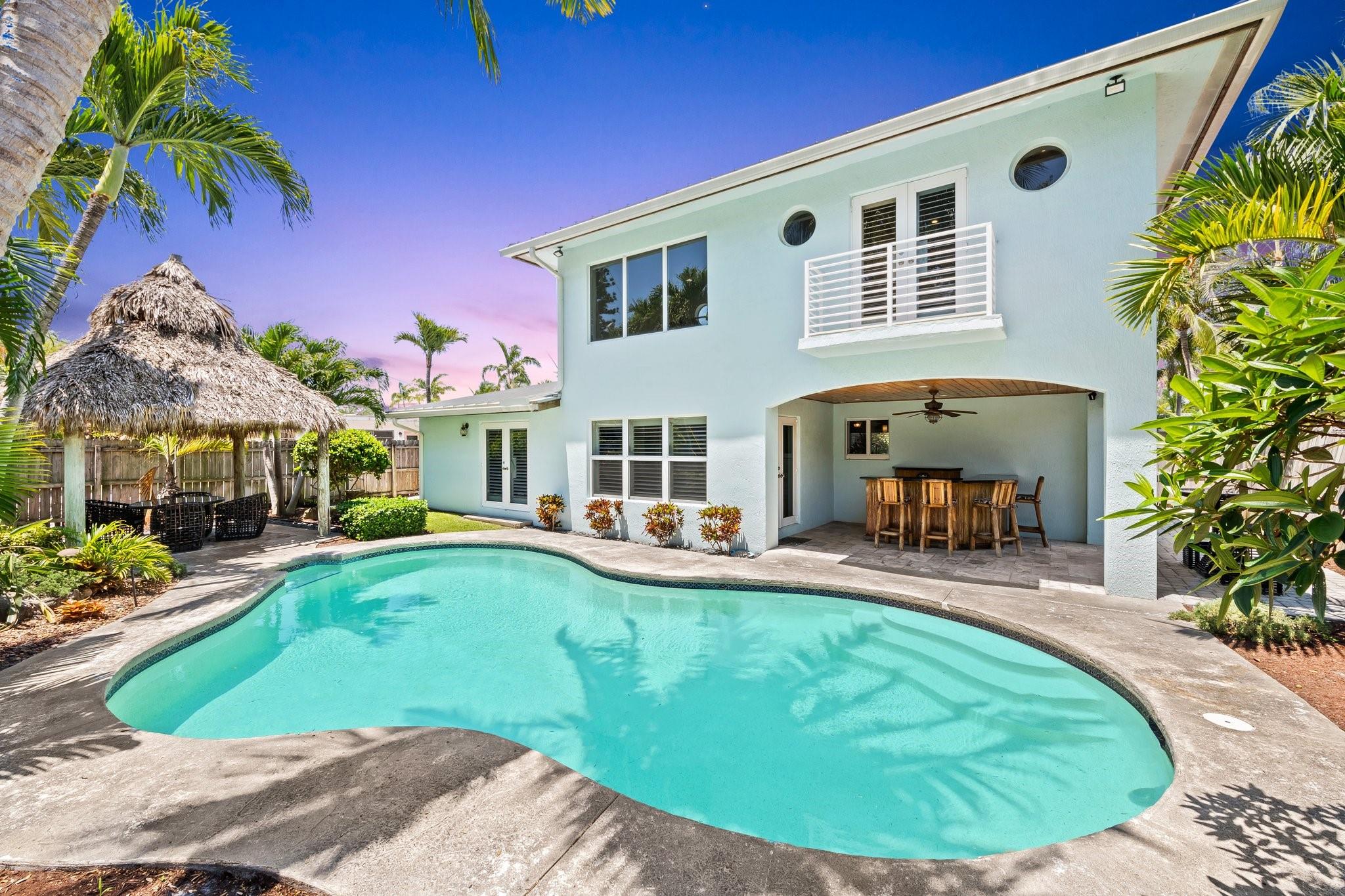 Nestled in the heart of Lighthouse Point, this residence blends modern elegance with tropical coastal living. Inside, you'll find a welcoming ambiance with a thoughtfully designed kitchen and living area, high ceilings, and hurricane impact windows and doors throughout. The first floor includes the primary suite and a guest bedroom, while upstairs offers a cozy den and an additional guest room & full bath. Fully renovated in 2008, this home features an aluminum metal roof and updated PVC plumbing. The backyard is an entertainer's dream, complete with a pool, a generously sized covered patio with a bar, and a Tiki Hut--this is the perfect setting for entertaining guests or relaxing by the pool. Walk to Publix, Whole Foods & restaurants. The beach is just a short golf cart or bike ride away!