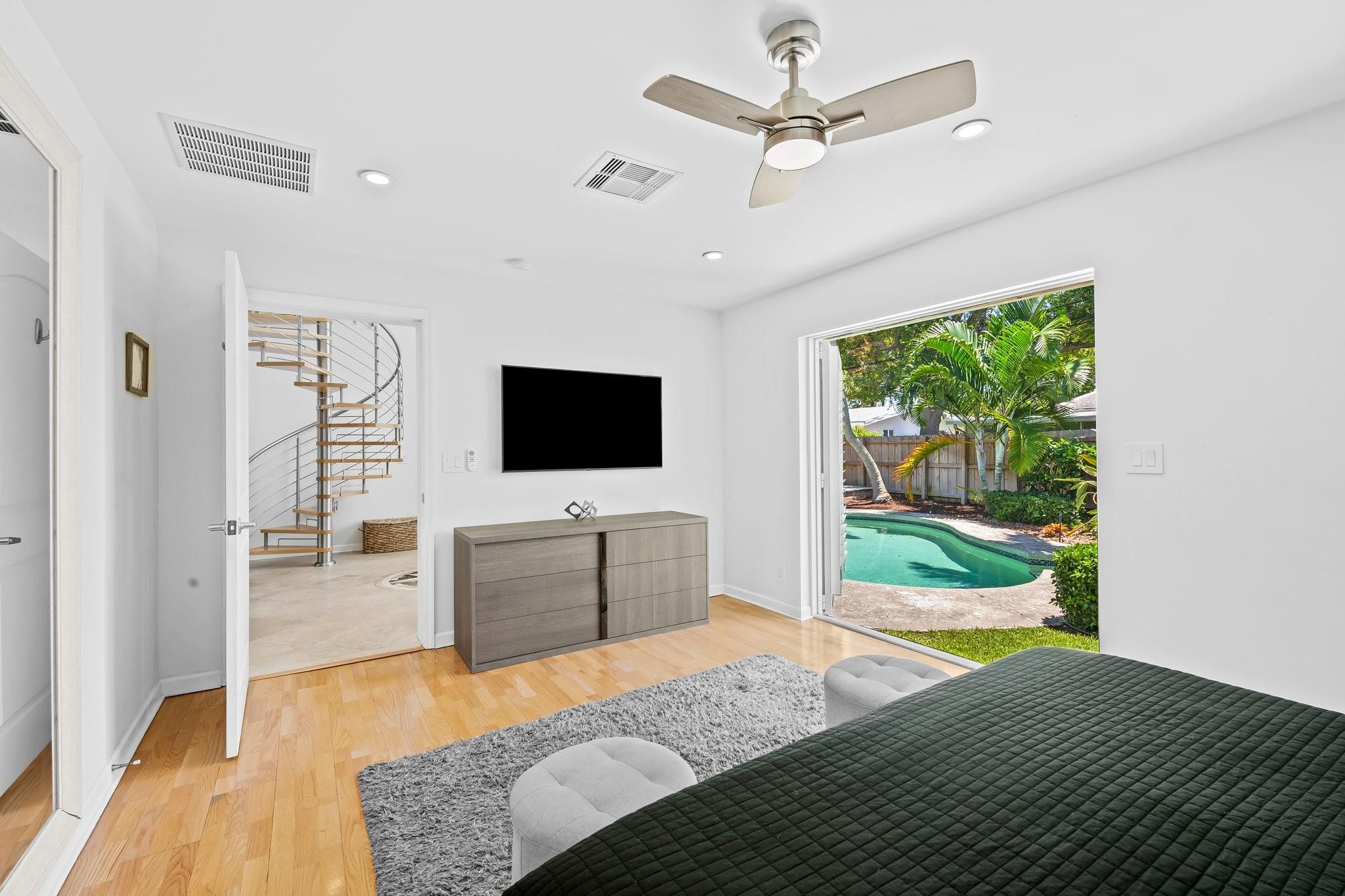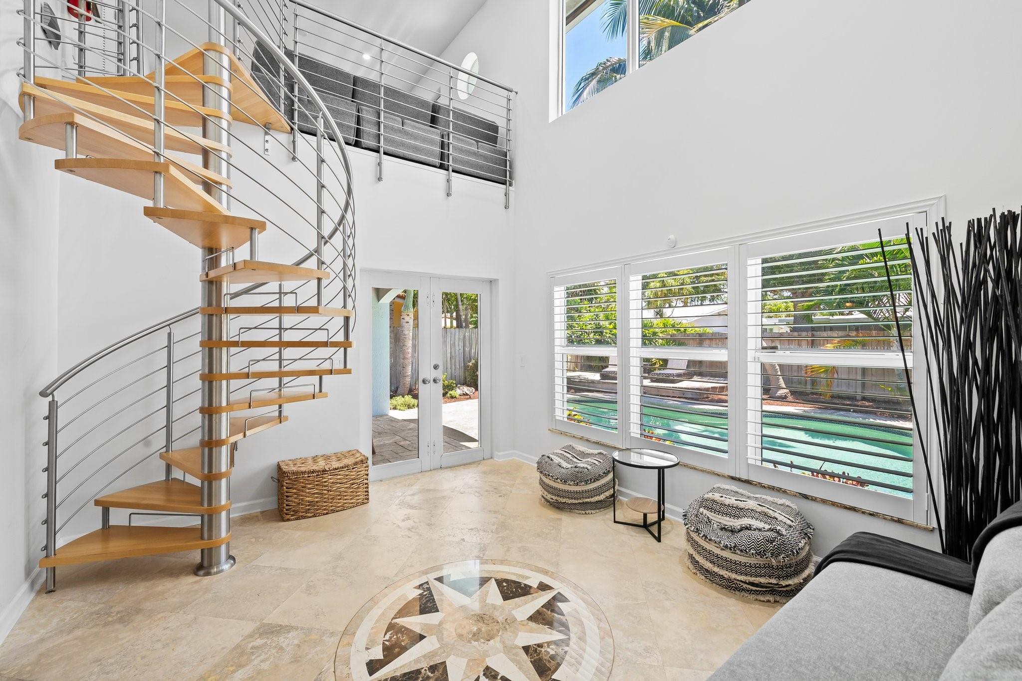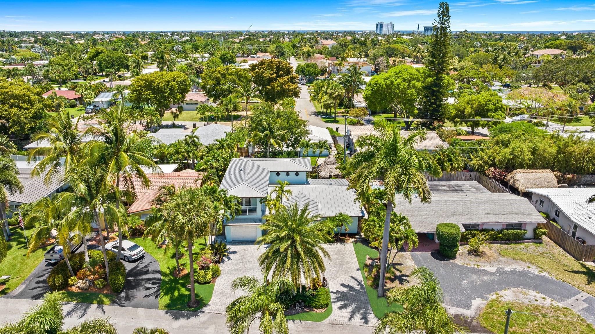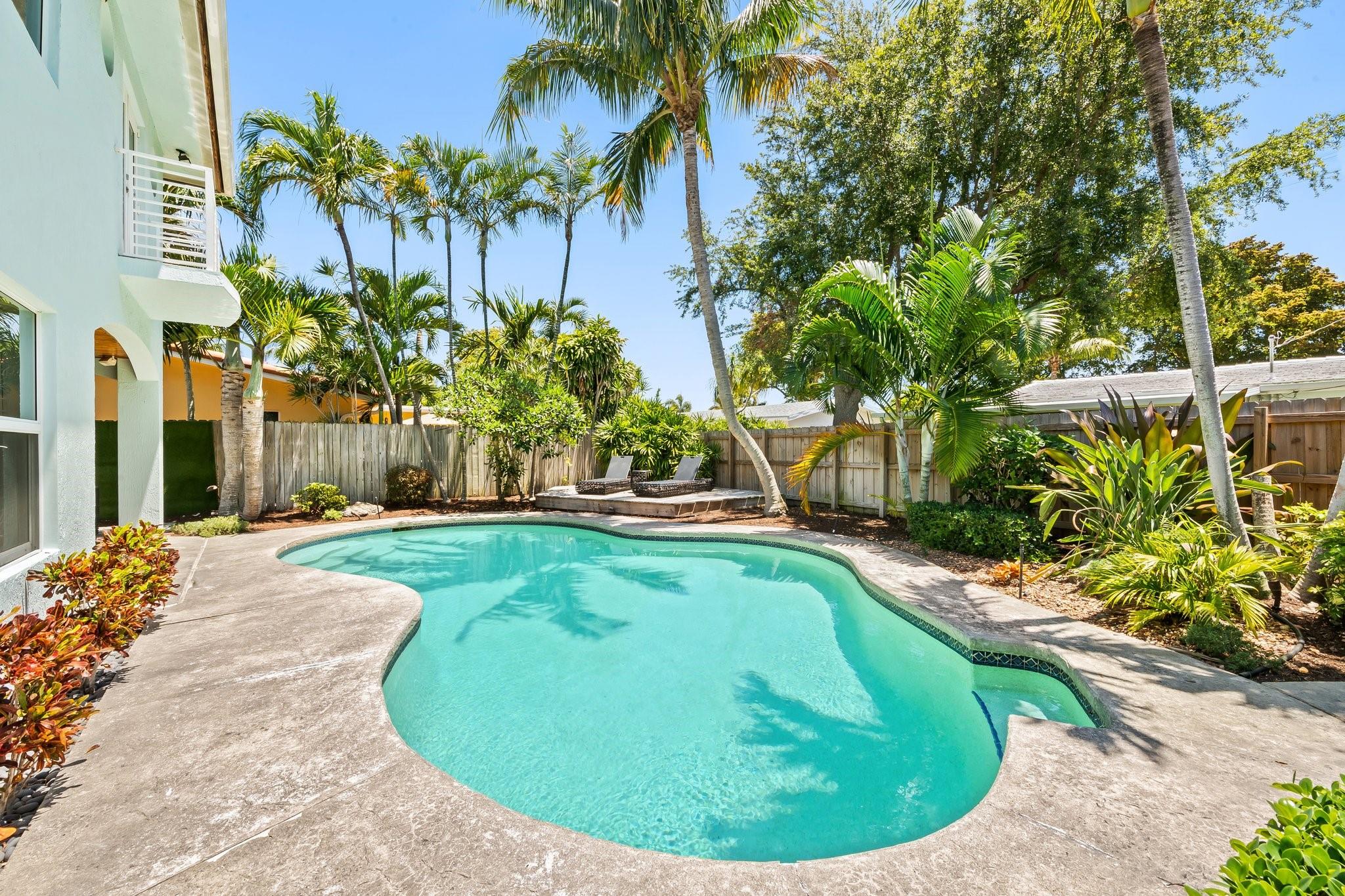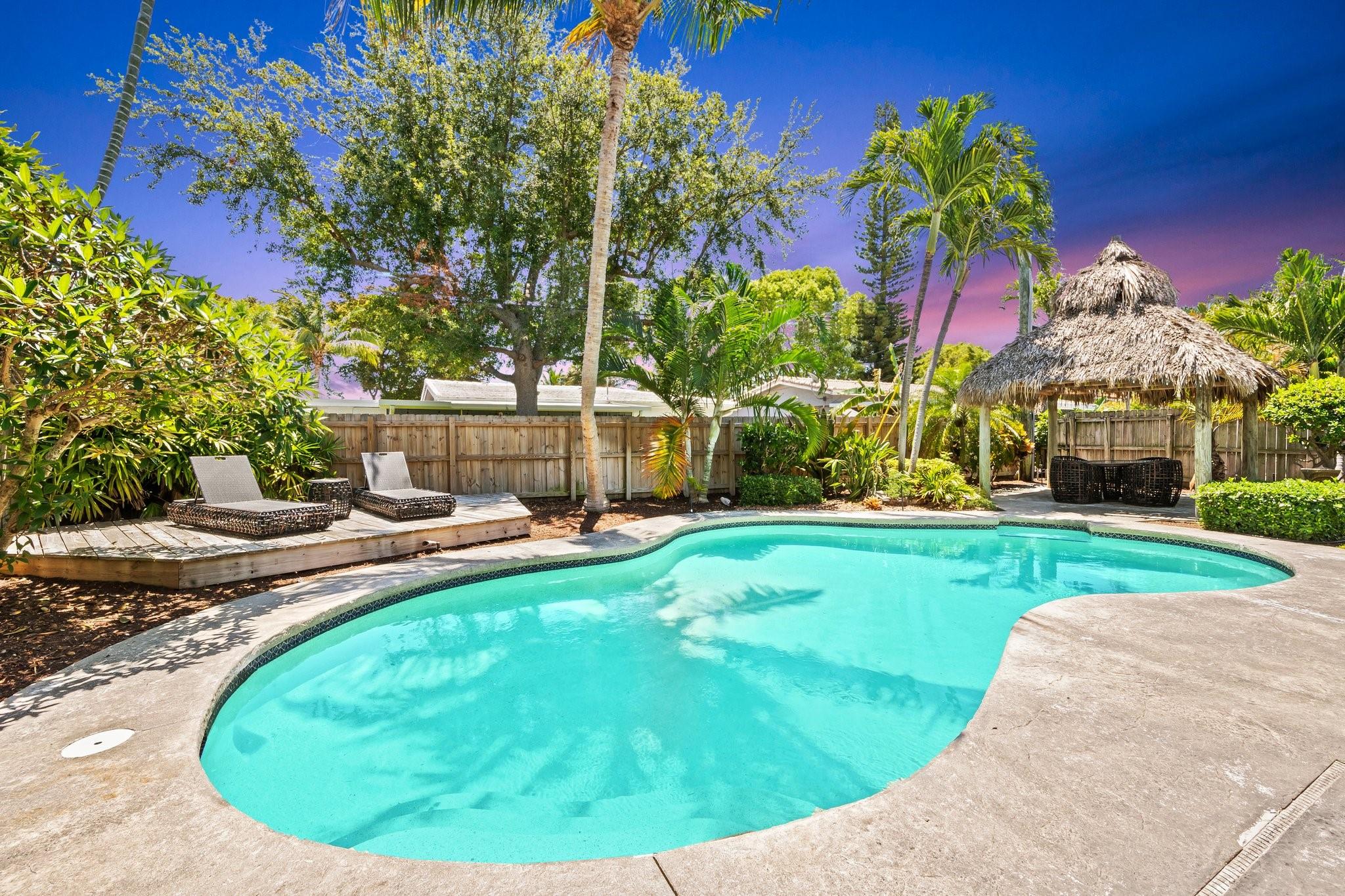 Nestled in the heart of Lighthouse Point, this residence blends modern elegance with tropical coastal living. Inside, you'll find a welcoming ambiance with a thoughtfully designed kitchen and living area, high ceilings, and hurricane impact windows and doors throughout. The first floor includes the primary suite and a guest bedroom, while upstairs offers a cozy den and an additional guest room & full bath. Fully renovated in 2008, this home features an aluminum metal roof and updated PVC plumbing. The backyard is an entertainer's dream, complete with a pool, a generously sized covered patio with a bar, and a Tiki Hut--this is the perfect setting for entertaining guests or relaxing by the pool. Walk to Publix, Whole Foods & restaurants. The beach is just a short golf cart or bike ride away!
